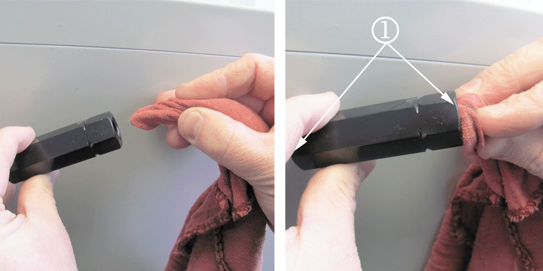 9. Using a shop towel, wipe the threads and end faces (1) clean. Do not use solvents to clean threads.