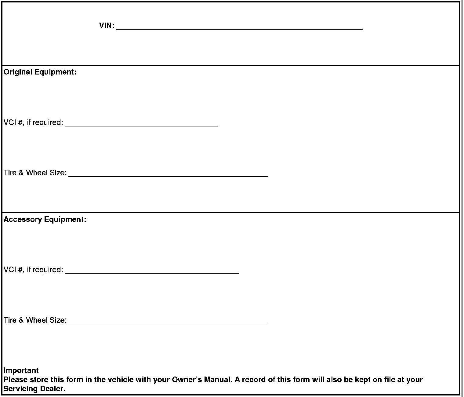 You have just modified your vehicle by installing an "Accessory Package" which includes Wheels and Tires. This form contains important information about your accessory installation. In an effort to provide superior service to you, our customer, we ask that you please present this form to your Servicing Dealer when removing or installing wheels and tires on your vehicle. This form contains important information necessary to service your vehicle.