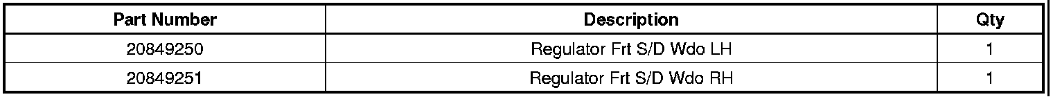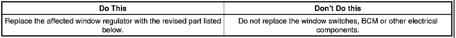 Replace the affected power window regulator with the revised part listed below. Refer to Front Side Door Window Regulator Replacement in SI.