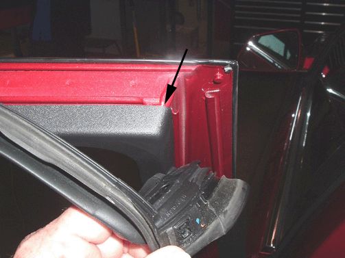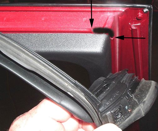 4. Remove the weatherstrip at the top of the door and apply a small amount of Kent High Tech Seam Sealer, Clear, P/N10200*, or the equivalent, to the door frame as shown in the illustration. Apply sealer from where the run channel retainer stops down to where it starts again. Install the weatherstrip to the door and remove any excess sealer.