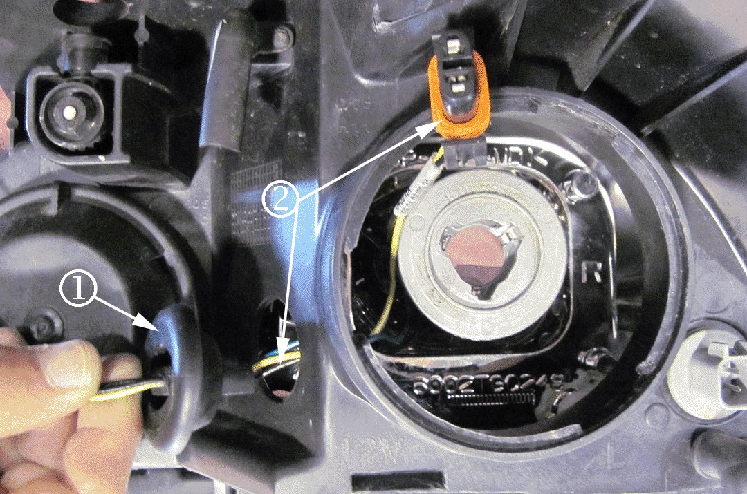 11. Reinstall the wiring harness inside the headlamp housing and attach the connectors to the bulbs.