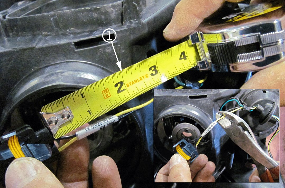 If the head lamp wiring harness already has a service pigtail and connector attached with a splice, cut the wiring harness beyond the existing splice to ensure the old splice is removed from the head lamp harness.