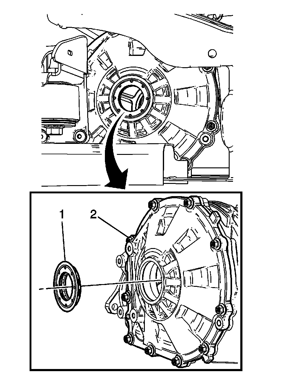 4. Using a flat-bladed screwdriver, remove the drive axle flange axle seal (1) from the differential side cover (2).