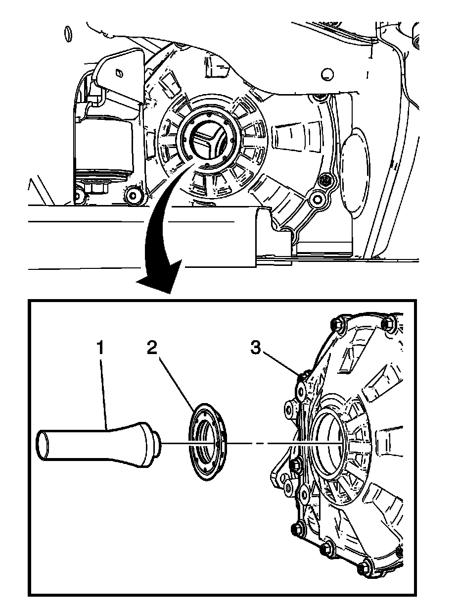 2. Using the J 21426 (1) and a hammer, install the drive axle flange seal (2) in the differential side cover (3).