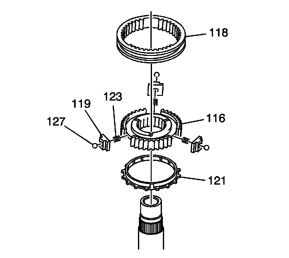 * The 3rd/4th gear synchronizer hub (116) including the spring (123), detent ball (127) and insert (119)
