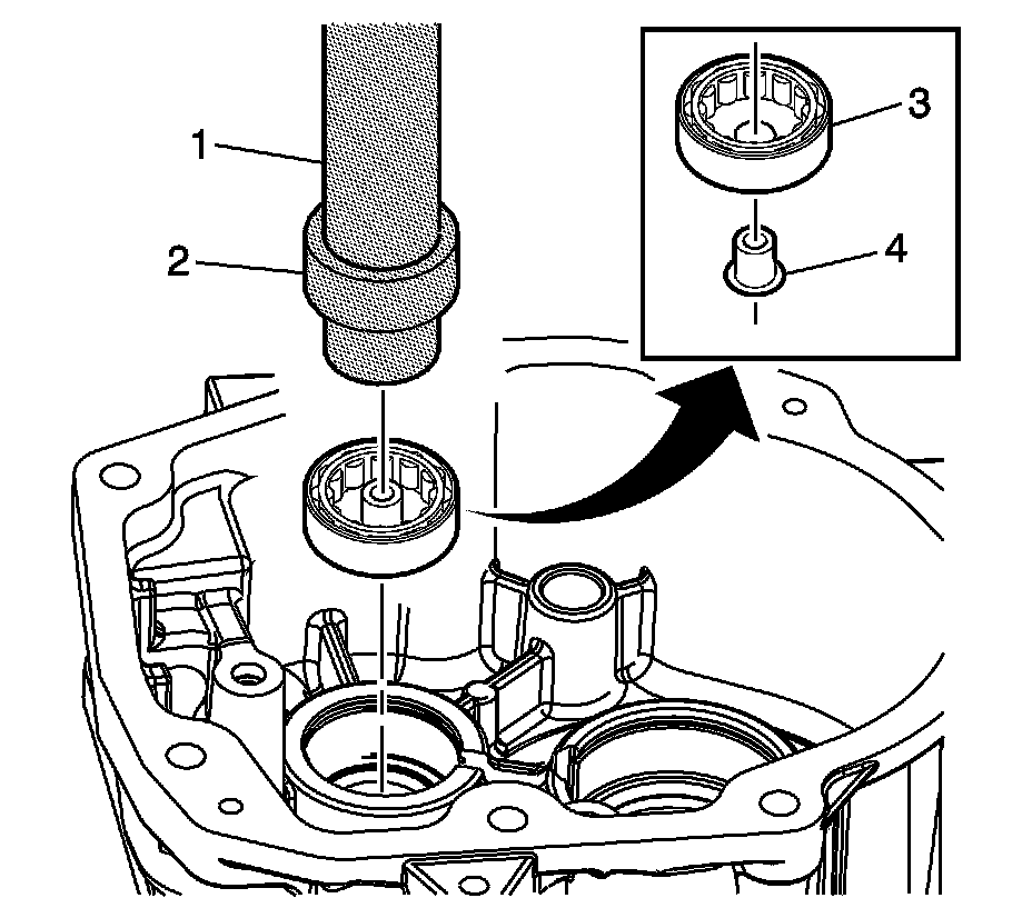 1. Using J 36190 - handle (1) and J 39439-3 - installer (2), install the reverse rail bushing.