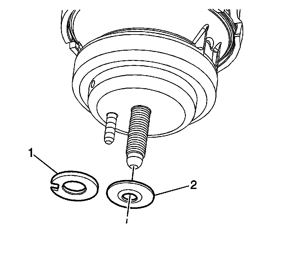 6. Ensure the slotted washer (1) or the plastisol insert washer (2) is properly installed between the engine mount and the frame.