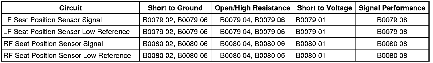 The SDM detects the RF seat position sensor signal circuit is shorted to ground or an open for 500 milliseconds.