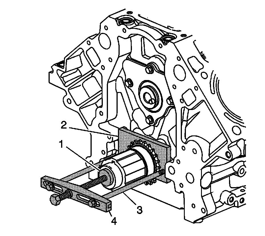 4. Use the J 41816-2 - protector (1), the J 41558 - remover (2), bolts (3), and the J 8433 - puller (4) in order to remove the crankshaft sprocket.