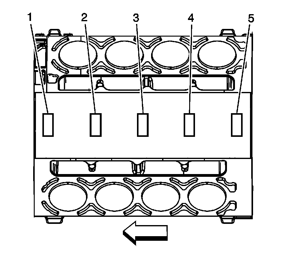 1. Measure the engine block camshaft bearing bores (1-5) in order to identify the correct OD size bearing for each position. Refer to Engine Mechanical Specifications (Specifications).