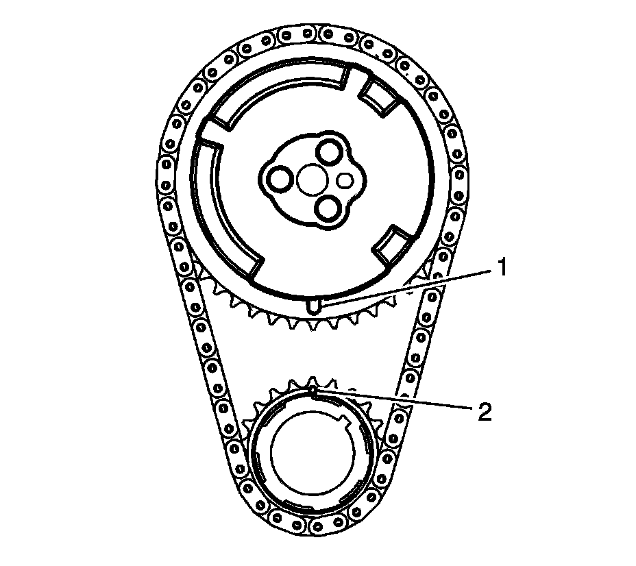 9. Inspect the sprockets for proper alignment. The mark on the camshaft sprocket (1) should be located in the 6 o'clock position and the mark on the crankshaft sprocket (2) should be located in the 12 o'clock position.