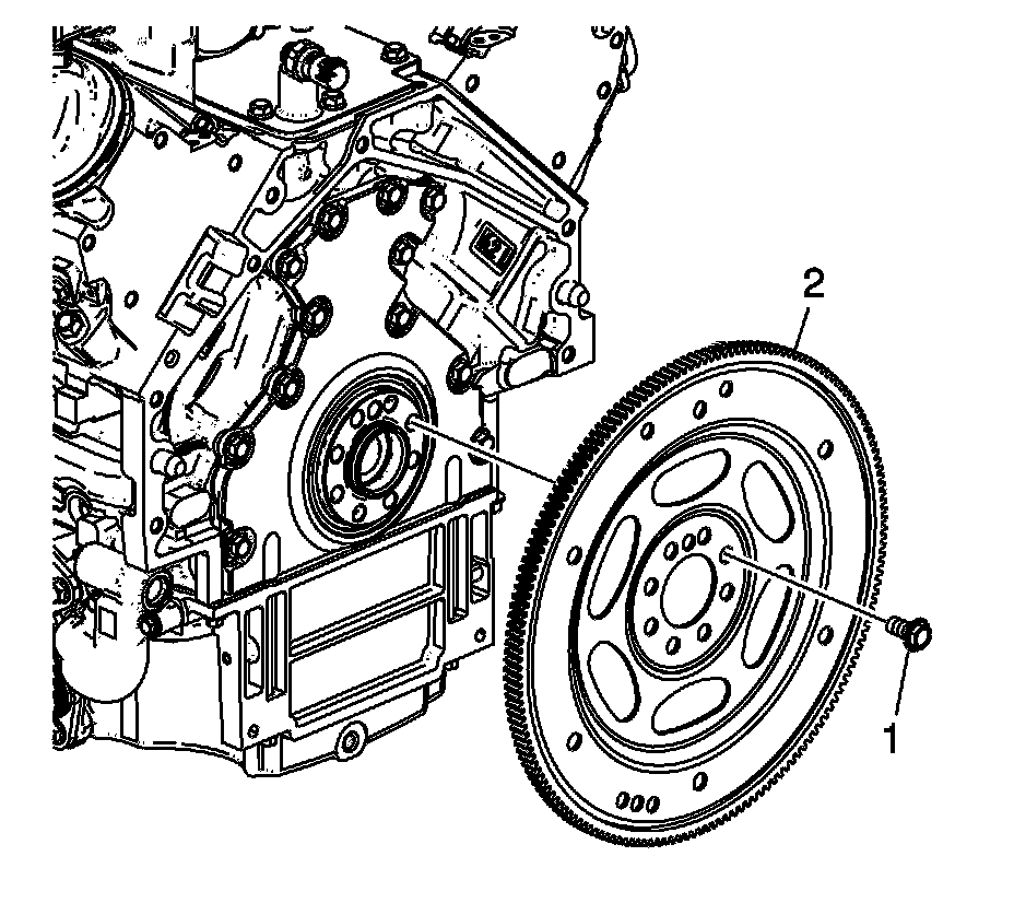 2. Install the manual transmission flywheel (2) to the crankshaft, if applicable. Refer to Engine Balancing (Procedures).