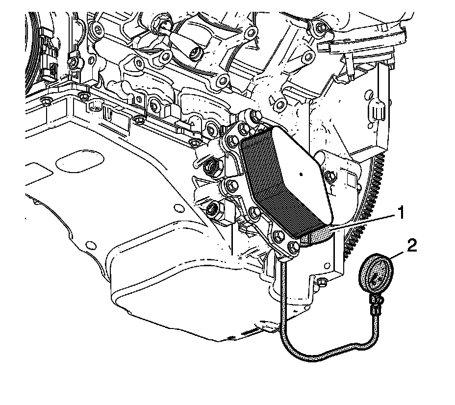 7. Install the J 21867 - gage (2), or equivalent to the EN 47971 - adapter (1).