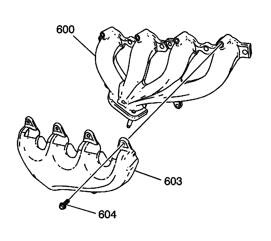 2. Remove the bolts (604) securing the exhaust manifold heat shield (603) to the exhaust manifold (600).