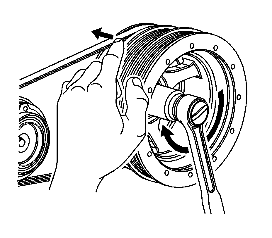 5. Slowly rotate the crankshaft pulley in a clockwise direction while using finger pressure to ensure the belt remains on the crankshaft pulley and does not walk off.