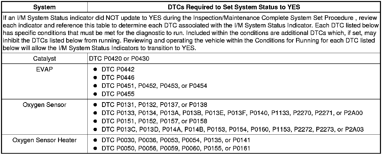 Inspection/Maintenance System DTC Table