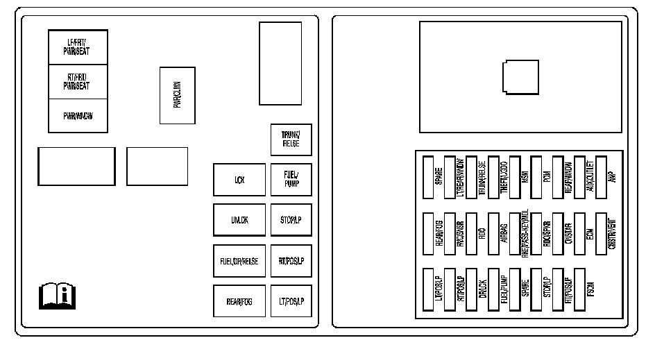 The rear compartment fuse block is located on top of the battery, on the right side of the trunk. The battery access door must be removed to access the fuse block.