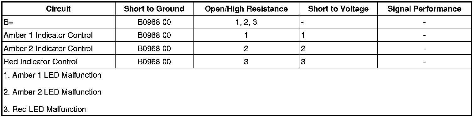 Ignition ON, command the Rear Red LED, Rear Yellow LED 1, and Rear Yellow LED 2 ON and OFF with a scan tool. The appropriate indicator should turn on and off as commanded.