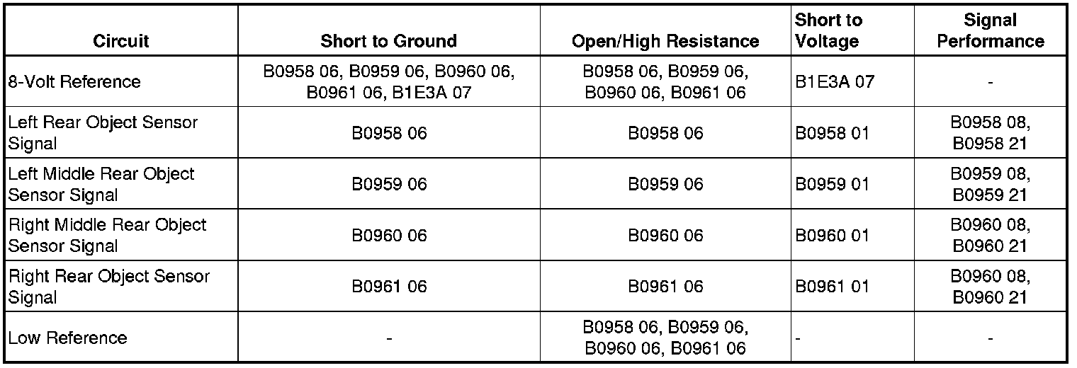 • If the DTC is set, test the 8-volt reference circuit terminal 1 for a short to voltage, short to ground, or an open/high resistance. If circuit tests normal, replace the object alarm module.