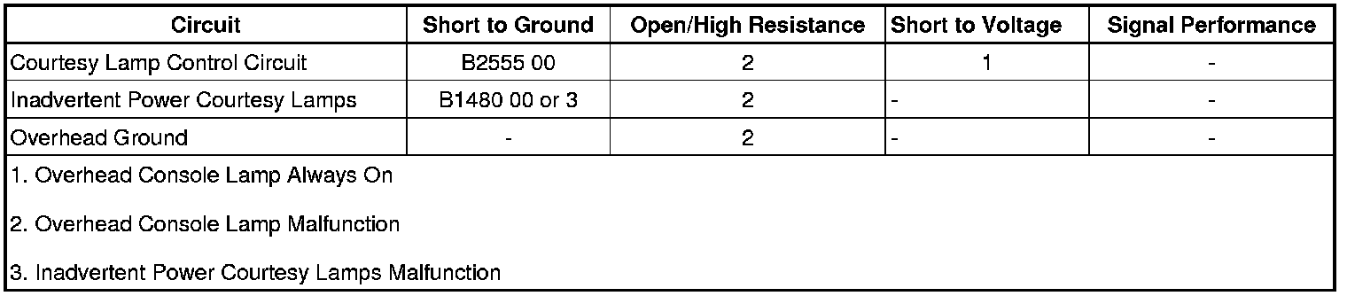 The CTSY/RF TRN fuse supplies battery voltage to the body control module (BCM). When the BCM commands the courtesy lamps ON, it applies battery voltage through the courtesy lamp relay control circuit to the coil side of the OVRHD LAMPS Relay, energizing the relay. Battery voltage from the inadvertent power courtesy lamp circuit is applied through the switch side of the relay and the courtesy lamp supply voltage circuit to the overhead console lamp, illuminating the courtesy lamp. The BCM also applies battery voltage through the courtesy lamp supply voltage circuit to the left and right roof rail courtesy lamps and the front, middle, and rear door courtesy lamps. When any door is opened, the door open switch contacts close and the BCM receives a door-open input and it will illuminate the courtesy lamps. If the BCM receives a door lock or unlock input or a rear hatch open input, it will illuminate the courtesy lamps.
