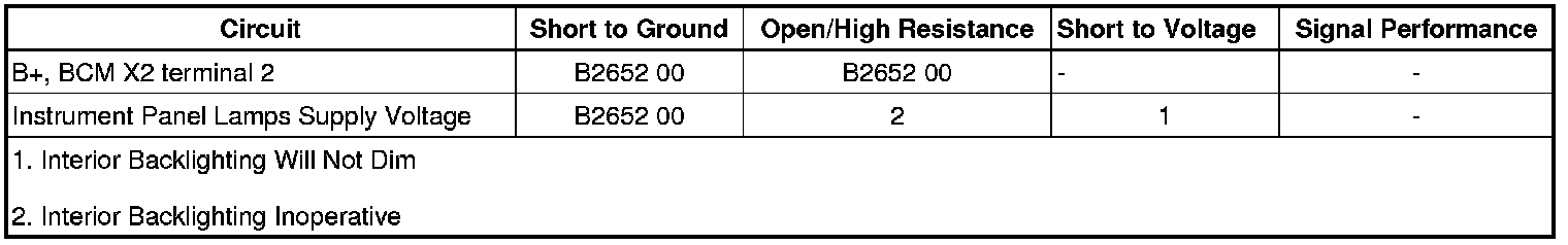 The body control module (BCM) supplies a voltage reference through the instrument panel (I/P) dimming voltage reference circuit to the interior lamp dimmer switch, which is part of the headlamp switch. When the dimmer switch is placed in a desired position, reference voltage is applied through the dimmer switch rheostat and the I/P lamps dimmer switch signal circuit to the BCM. The BCM interprets this voltage signal, then applies a pulse width modulated (PWM) voltage, supplied by the SWITCH DM Fuse located in the rear fuse block, through the instrument panel lamp supply voltage circuits illuminating the components listed below.