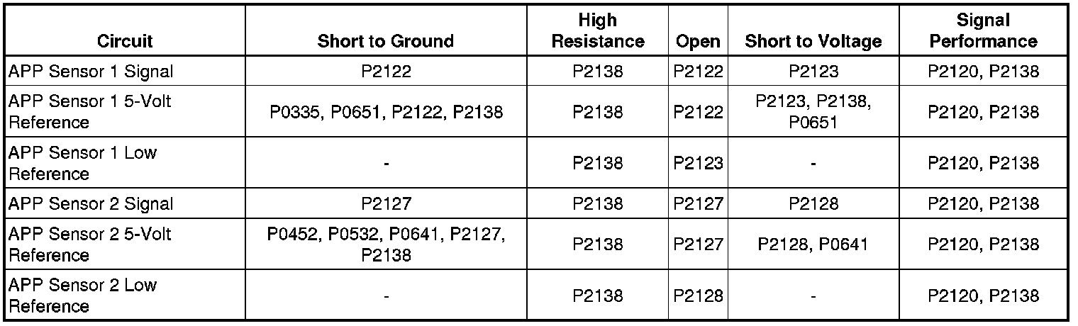 The voltage difference between APP sensor 1 and APP sensor 2 exceeds a value of 5 percent with the pedal in the released position, or 10 percent with the pedal at wide open throttle (WOT) for less than 1 second.