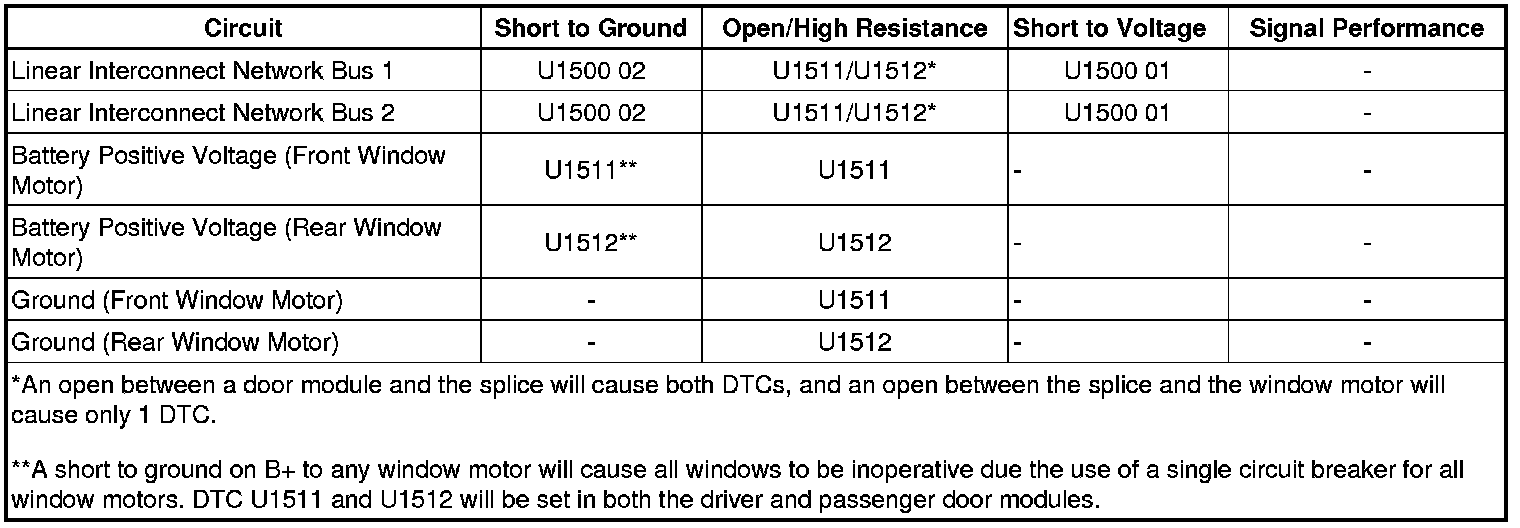 The driver door module (DDM) and the front passenger door module (FPDM) communicate with window regulator motors on the local interconnect network bus 1 and the local interconnect network bus 2 circuits respectively. The DDM LIN bus is connected to all window regulator motors on its side of the vehicle, while the FPDM LIN bus is connected to the other window regulator motors. Communication on this network is only between the door modules and the window regulator motors. The window regulator motors are in effect modules. The window regulator motors do not communicate on any other data bus, therefore the door modules, which also communicate on the low speed GMLAN serial data bus will perform all communication with each other. If the driver depresses any passenger side window switch on the driver window switch the DDM communicates the information to the FPDM for operation. These DTCs will set in the DDM for driver side concerns or the FPDM for passenger side concerns.
