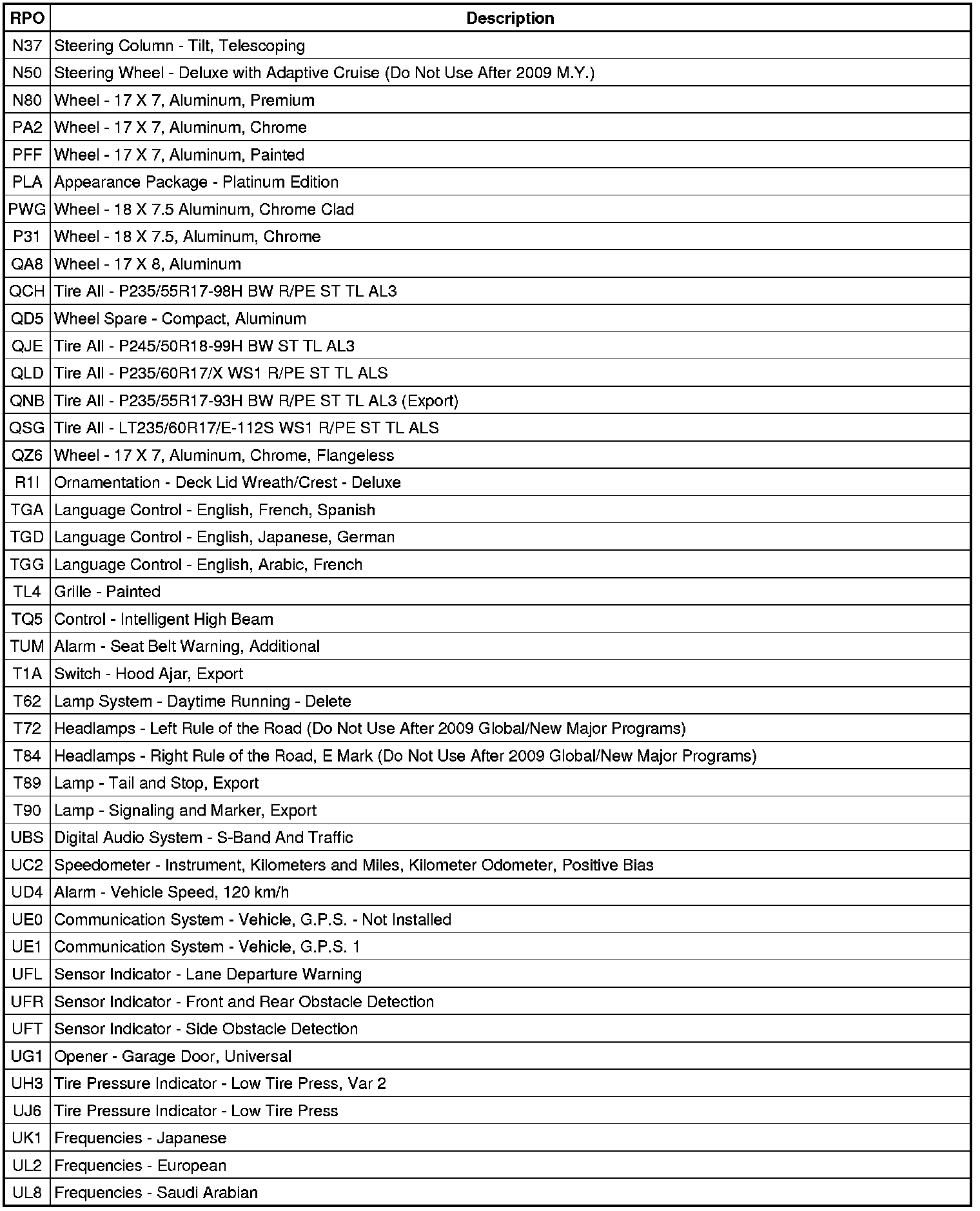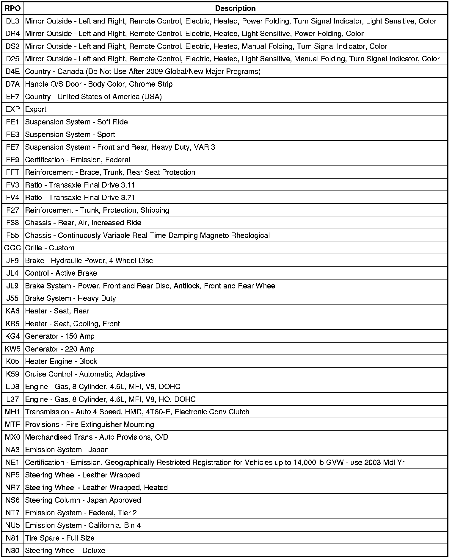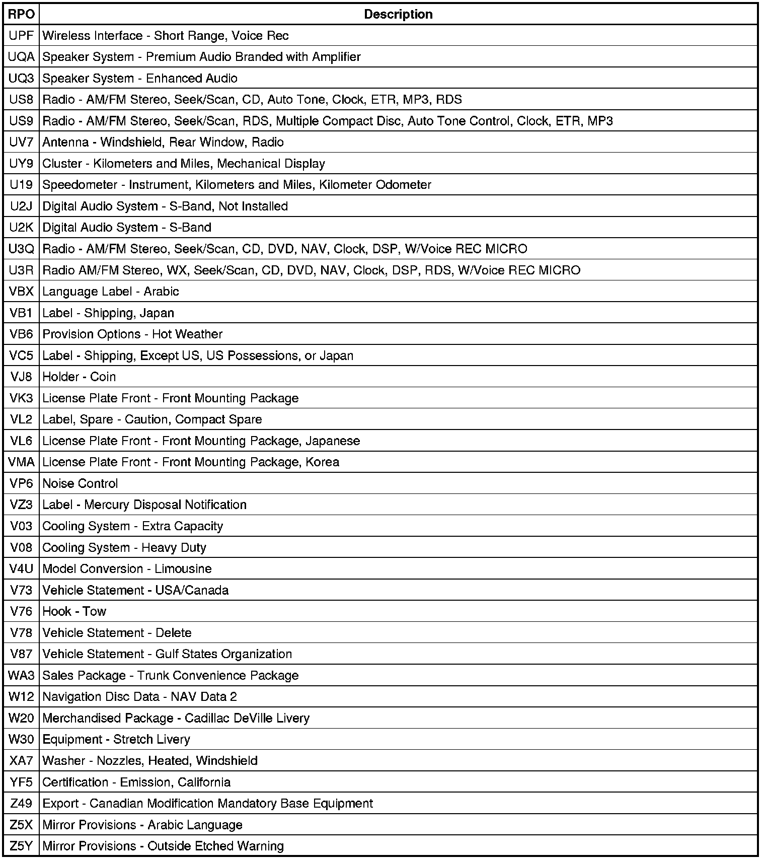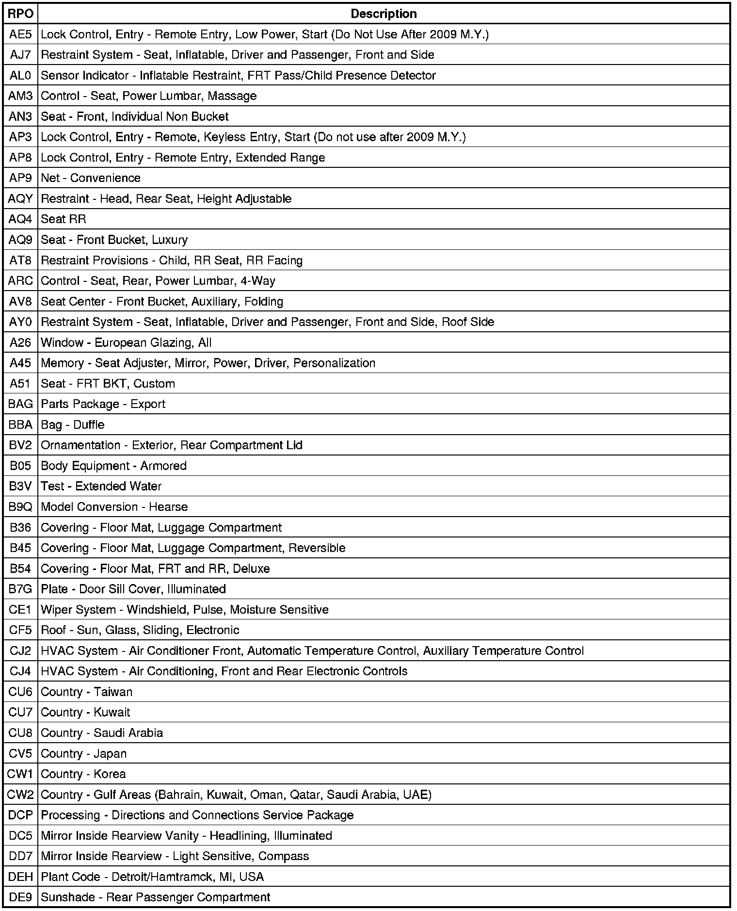 RPO Code List