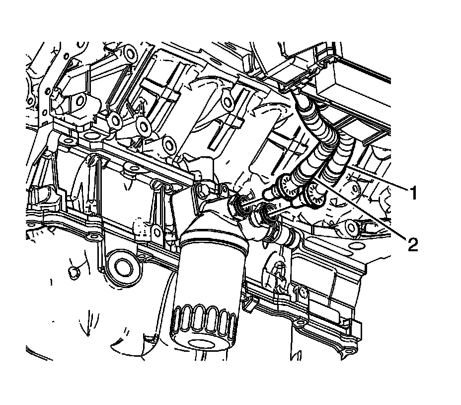 Important: Tug gently on the engine oil cooler lines (1, 2) at the oil filter adaptor to ensure proper retention.