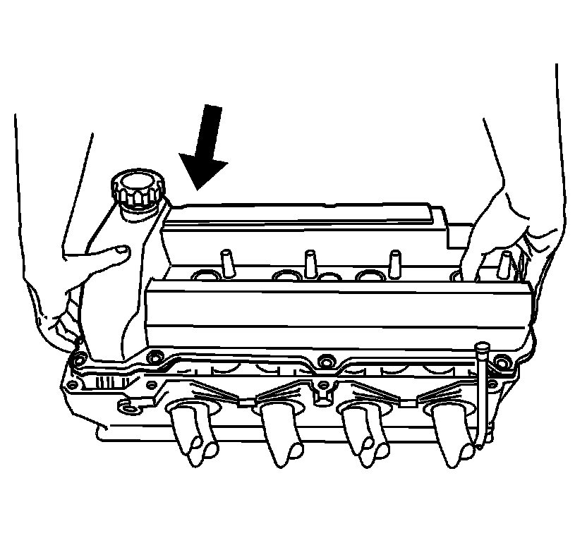 5. Using your fingers, guide the camshaft cover up over the edge of the cylinder head. Be careful not to damage the exposed section of the camshaft cover seal on the edge of the cylinder head.