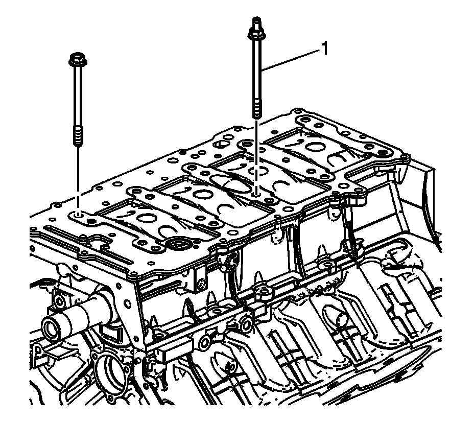 4. Remove the main bearing bolts. Note the location of the single stud-end bolt (1) used to attach the oil pump pickup tube.