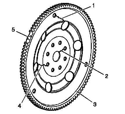 * Stress cracks around the engine flywheel-to-torque converter mounting bolt hole locations (1) and/or engine flywheel-to-crankshaft (2, 4)