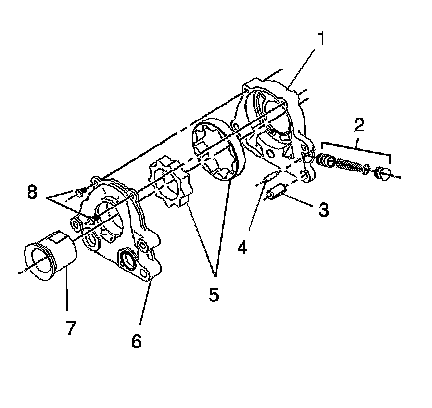 3. Remove the inner (drive) and the outer (driven) rotors (5) from the housing. Note the orientation of the pump rotors. The outer rotor has one chamfered edge. The chamfered edge must be face-down (closest to the rear of the engine) in the pump body (1).