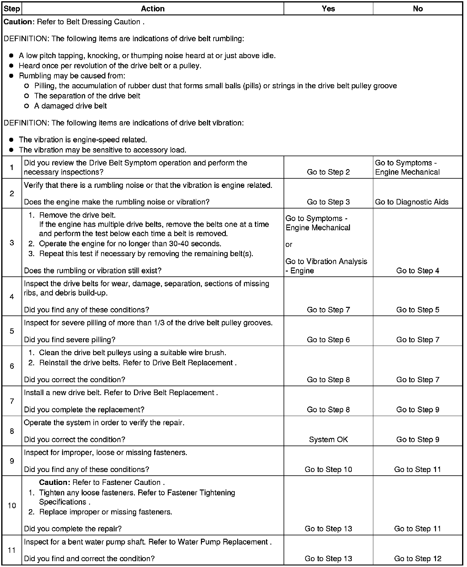 3. This test is to verify that one of the drive belts is causing the rumbling noise or vibration. Rumbling noise may be confused with an internal engine noise due to the similarity in the description. Remove only one drive belt at a time if the vehicle has multiple drive belts. When removing the drive belts the water pump may not be operating and the engine may overheat. Also DTCs may set when the engine is operating with the drive belts removed.
