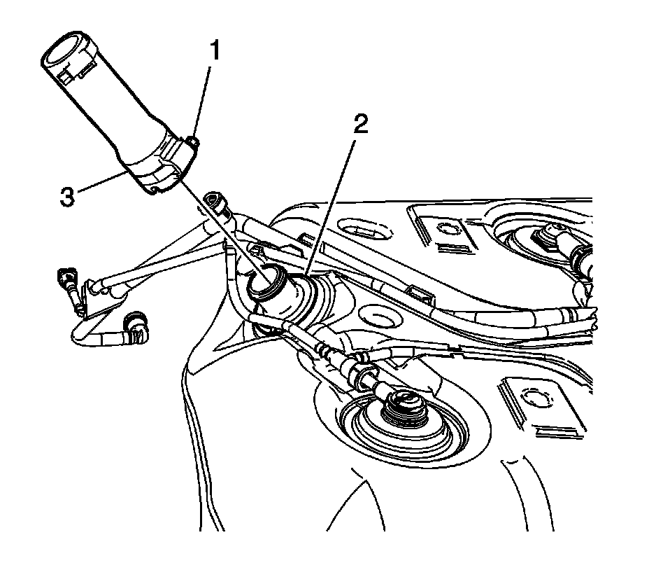 1. Install the fuel fill hose to the fuel tank. Ensure that the notch (3) in the fill hose is aligned with the notch on the fuel tank.