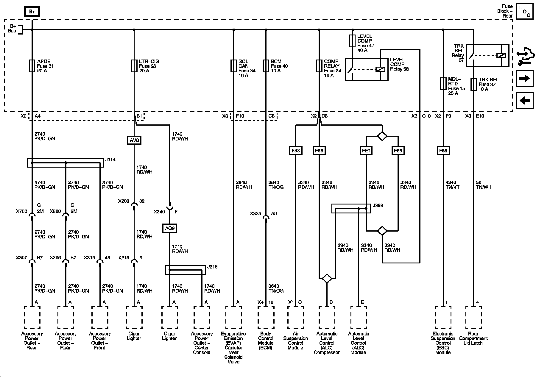 Rear Fuse Block - TRUNK RELSE Relay, AUX PWR, LTR/CNSL, CNSTR VENT, RVC SENSE, ELC MDL, MRTD MDL, TRUNK RELSE Fuses