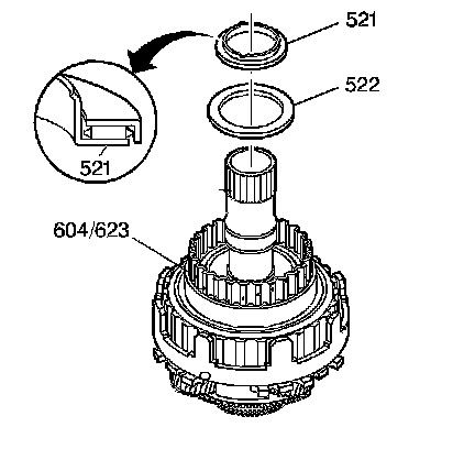 1. Remove the thrust bearing (521) and remove the selective thrust washer (522) from the third clutch housing (604).