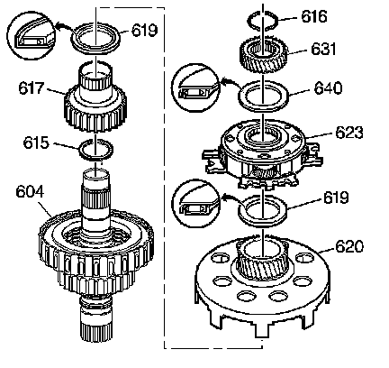 * The thrust bearing (619) from the 3rd clutch hub (617)