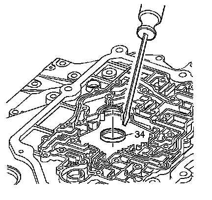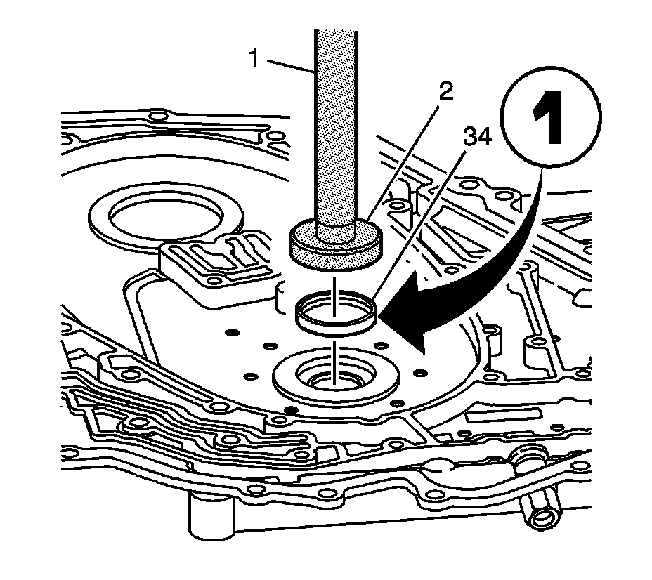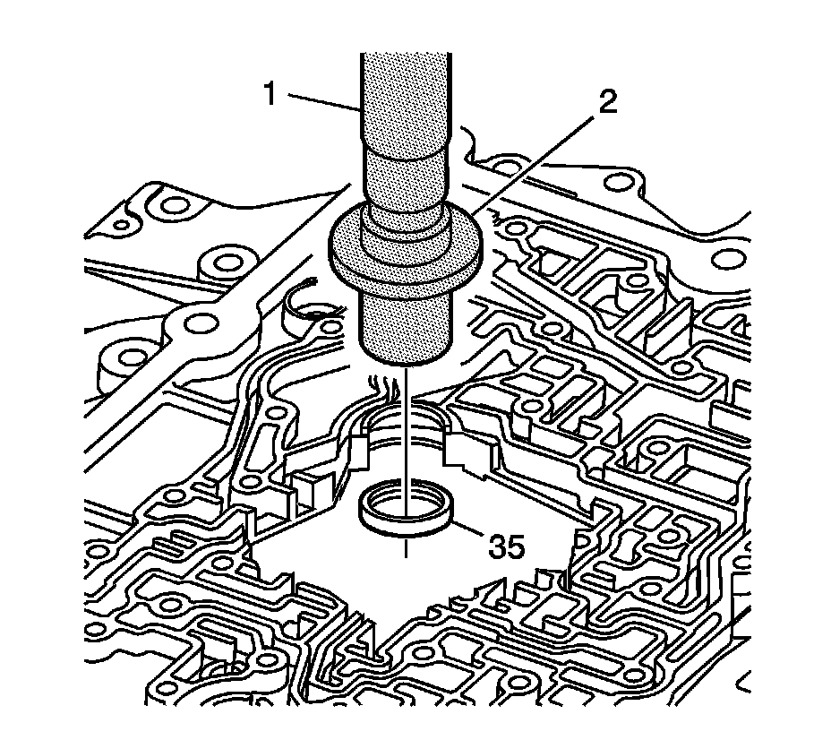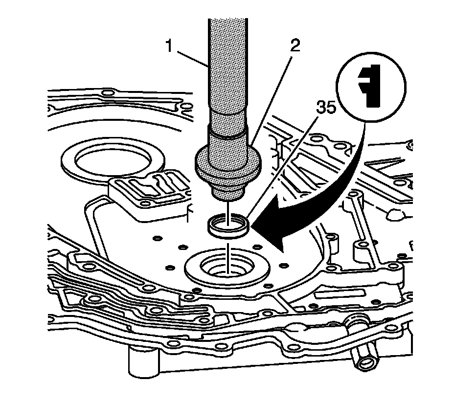 1. Using J 7079-2 - universal driver handle-non threaded (1) and the remover side of the J 39062 - Turbine Shaft Seal Tool (2), remove the case cover to turbine shaft seal (35).