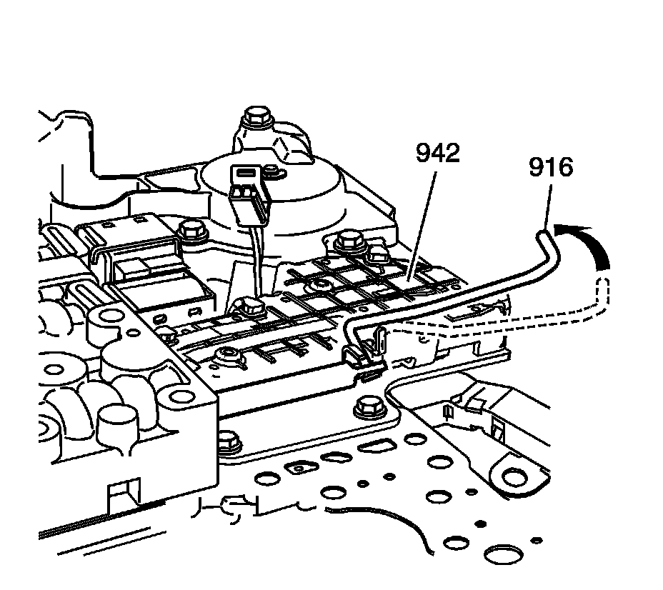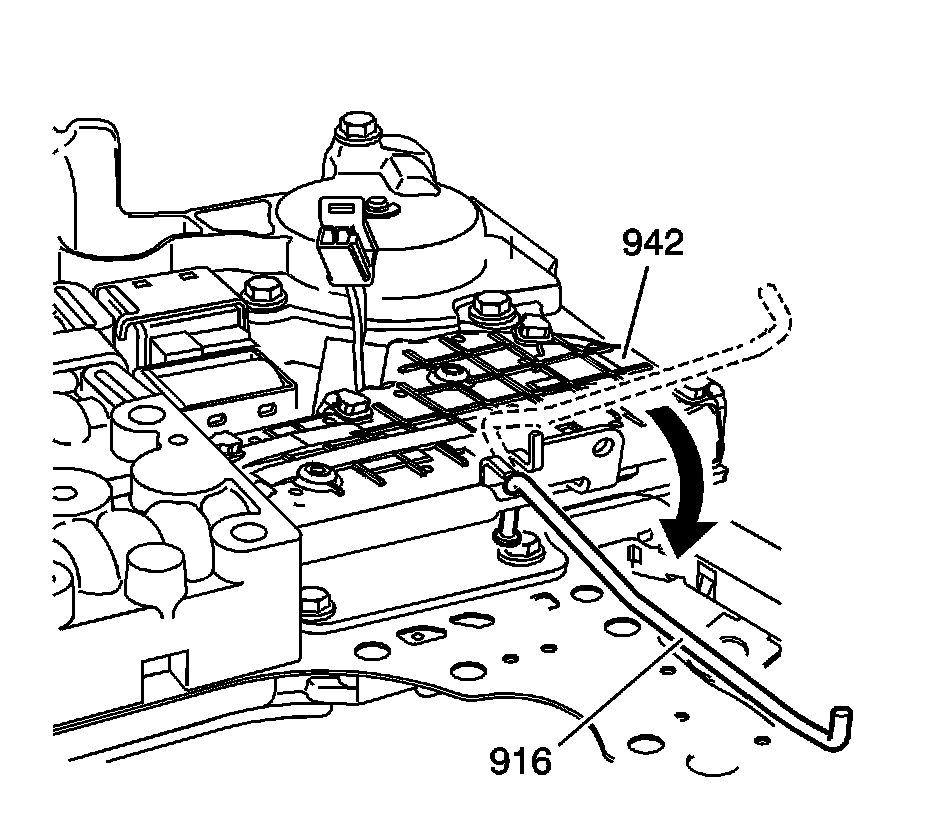 7. Turn the manual valve link 90 degrees and rotate the manual valve and link assembly (916) away from the IMS (942).