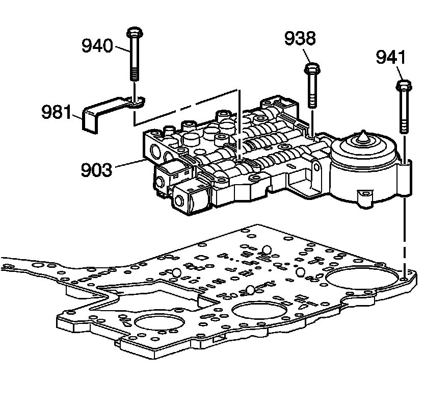 10. Remove the 15, 10 mm bolts (938, 940, 941) from the lower control valve body.