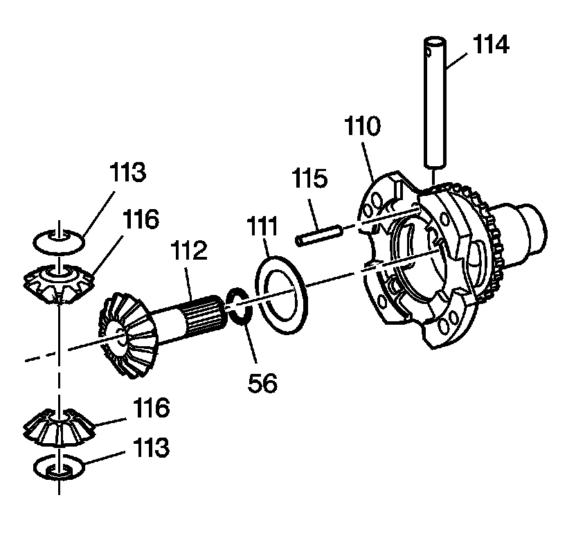 1. Use a pin punch to drive out the differential pinion shaft retaining pin (115). Remove the following parts: