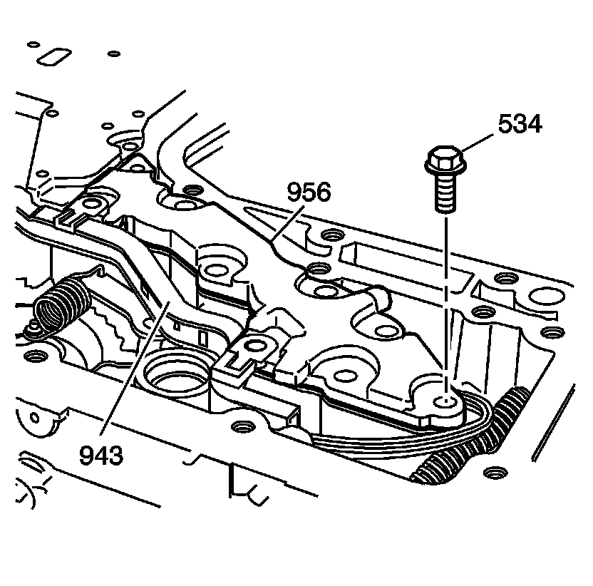 6. Hand start the bolts (534) to hold the oil transfer plate (956) in place with the lower control valve body wire harness retaining clips (943) attached properly, then tighten the bolts and nuts (534) to 8-14 Nm (6-10 lb ft).