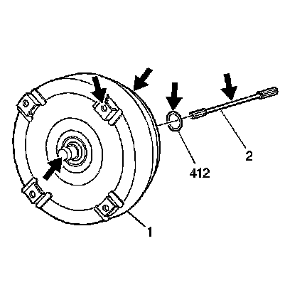 1. Inspect the torque converter (1) lugs for damage and inspect the oil pump driven shaft for damage. Replace the turbine shaft seal (412).