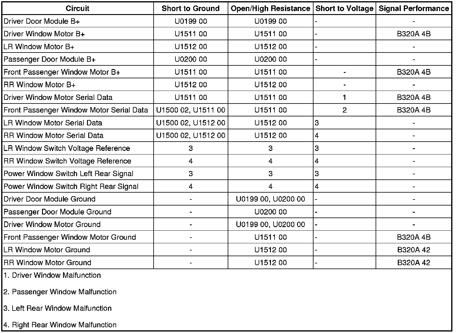 • If a power window does not perform the UP/DOWN command, refer to Power Window Motor Malfunction.