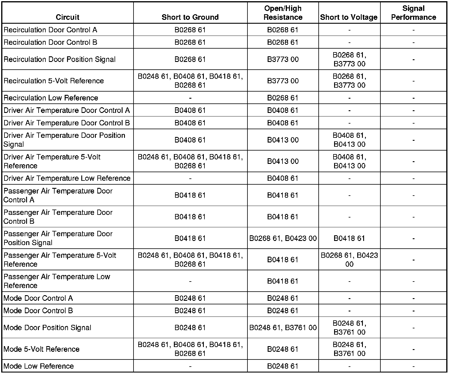 The actual door position differs from the commanded door position by more than 4 counts or the HVAC control module detects the door position signal circuit is less than 7 counts or greater than 250 counts.