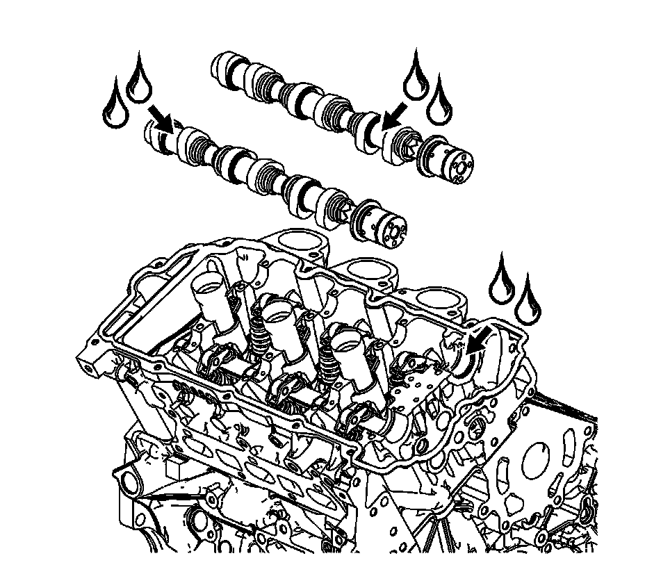 2. Apply a liberal amount of lubricant GM P/N 12345501 (Canadian P/N 992704) or equivalent to the camshaft journals and the right cylinder head camshaft carriers.