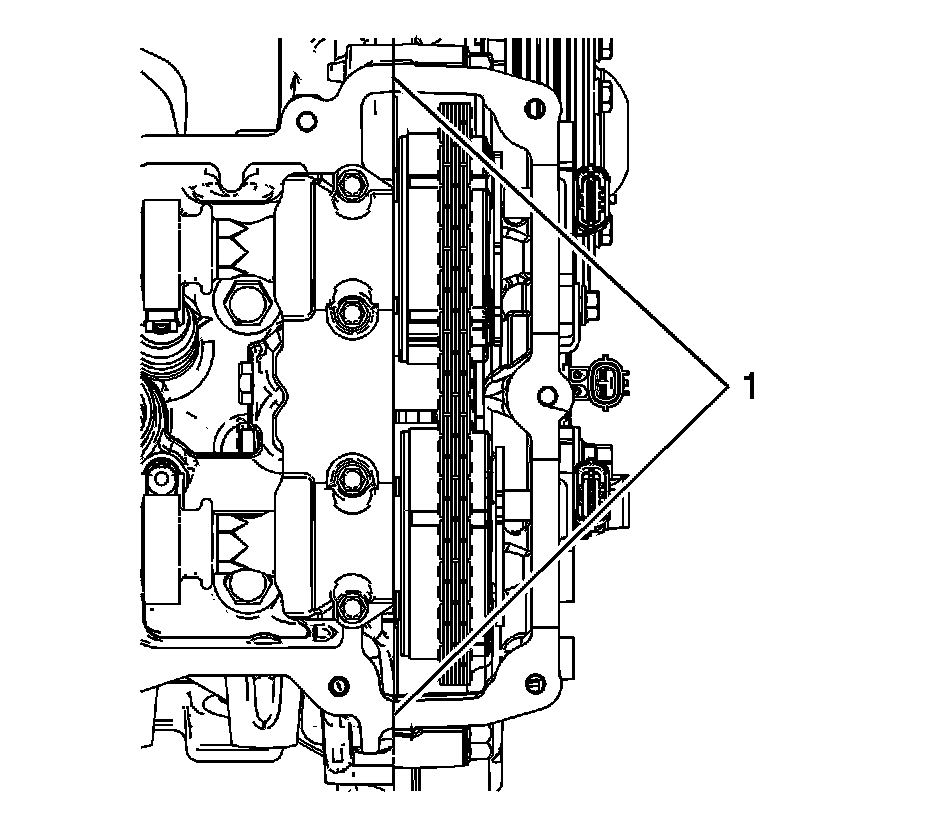 4. Place a bead 8 mm (0.3150 in) in diameter by 4 mm (0.1575 in) in height of RTV sealant, GM P/N 12378521 (Canadian P/N 88901148) or equivalent, on the engine front cover split lines (1).
