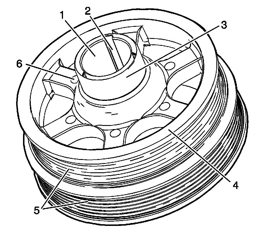 * Worn, grooved or damaged hub seal surface (3) - A crankshaft balancer hub seal surface with excessive scoring, grooves, rust or other damage must be replaced.