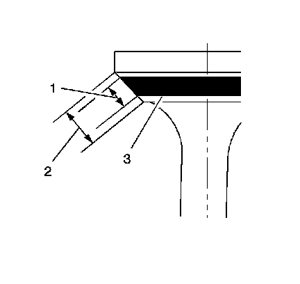3. Using the proper angle specification listed in Engine Mechanical Specifications (LLT) (Specifications) , grind, undercut, the valve seats (3) to narrow the valve seat widths to the specifications listed in Engine Mechanical Specifications (LLT) (Specifications).